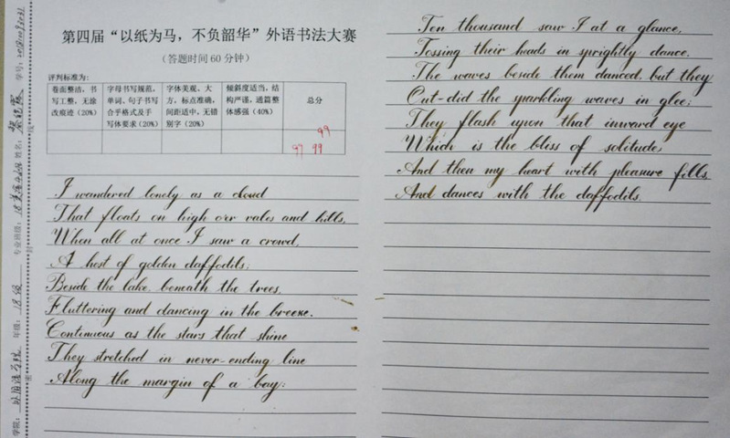 书法有着博大的文化魅力,在日常生活中得到了普遍的应用和受到广泛的欢迎,在引导学生们发挥创造能力,丰富精神内涵方面也有着举足轻重的作用。日本书坛巨匠井上有一曾说过自己“守贫挥毫六十七年”,在任何时候我们都可以提笔书写。自古至今,任何优秀书法作品,都是需要书写者日积月累的努力才能练就的。希望同学们能够在看完这么多收放有度,气韵生动的外语书法作品后积极地加入练习外语书法的行列中。