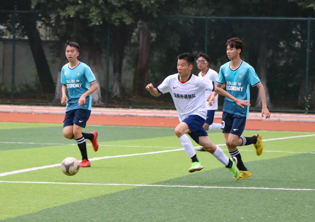 4月6日中午,烈日炎炎,绿茵赛场上国商外语联队与经济学院足球队进行着紧张激烈的竞争。让我们来回顾一下精彩的比赛。