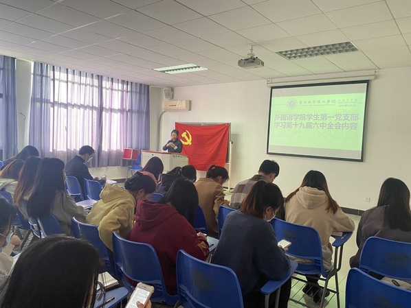 本网讯(记者 肖宝余)11月8日至11日,中国共产党第十九届中央委员会第六次全体会议在北京胜利召开,会上通过《中共中央关于党的百年奋斗重大成就和历史经验的决议》(以下简称《决议》)。为贯彻学习《决议》精神,外国语学院学生第一党支部于12月2日下午在A6-305组织支部师生党员共同进行党的十九届六中全会精神集体学习。