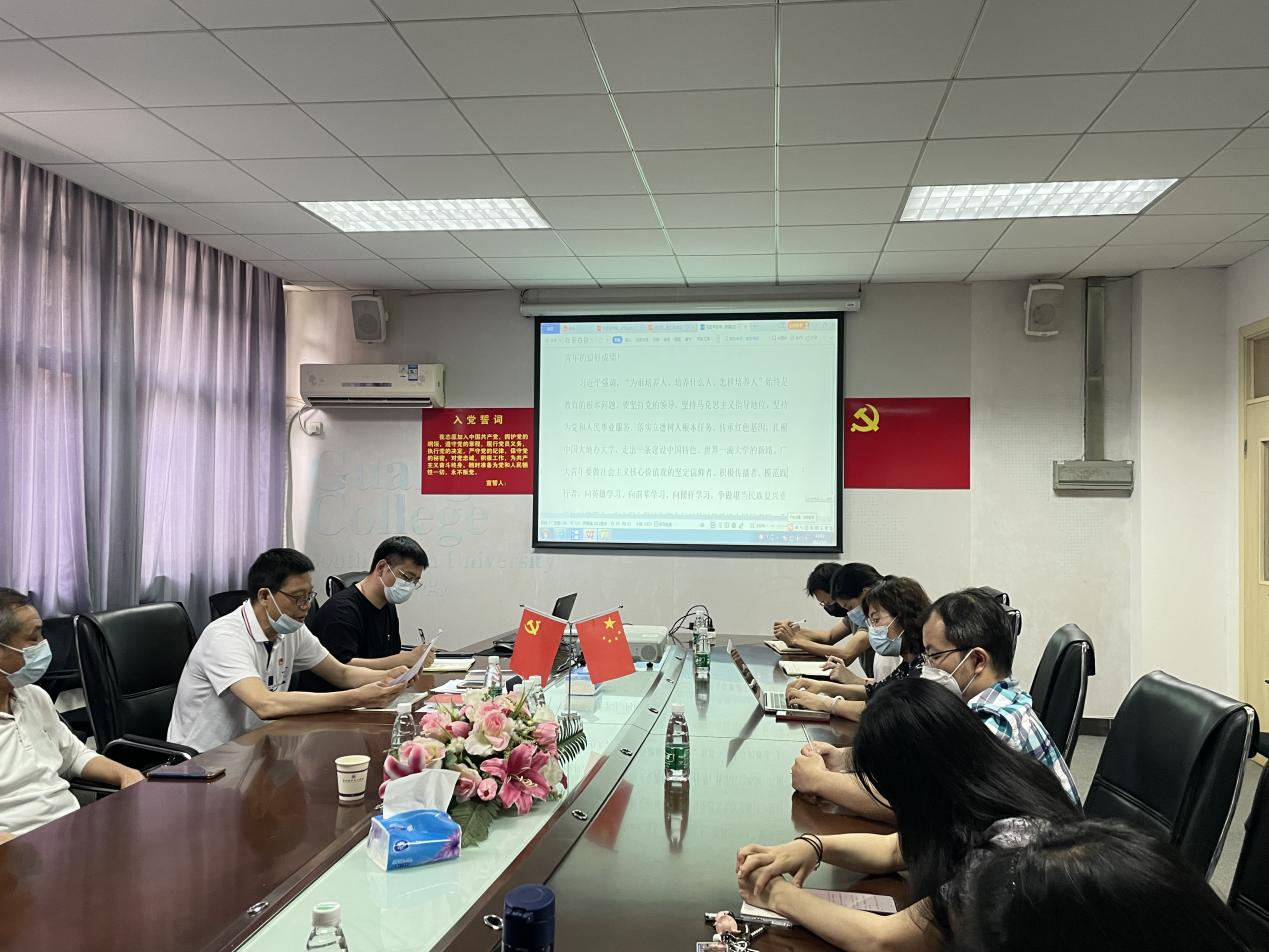 首先,党总支书记张四友同志领学了习近平总书记在中国人民大学考察调研的新闻稿:“坚持党的领导、传承红色基因、扎根中国大地,走出一条建设中国特色、世界一流大学新路”的主题内容,并共同观看了习近平总书记考察活动的视频;然后结合外国语学院工作实际交流了学习体会和感受。