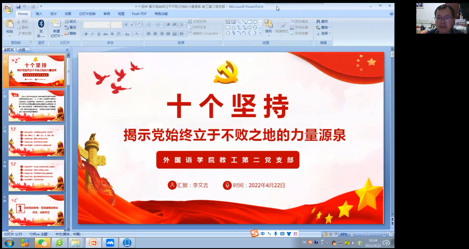 本网讯(记者 李文吉)4月22日晚上,为深入学习贯彻党的十九届六中全会精神,外国语学院教工第二党支部召开了以“深入学习宣传贯彻党的十九届六中全会精神”为主题的支部党员大会和以“贯彻十九届六中全会精神,把握‘十个坚持’历史经验”为专题的党课,支部全体党员参加了本次党员大会和党课学习。教工第二党支部组织委员李文吉同志主持了党员大会并主讲了党课。