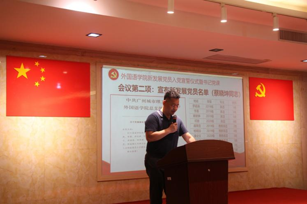 入党宣誓仪式在庄严雄壮的《国际歌》声中拉开帷幕。随后,外国语学院党总支副书记蔡晓坤同志宣读了2022年上半年新发展党员名单,他们分别是:罗超美、李嘉、郭依婷、邓扬、谭翠滢、杨绮琼、潘金文、郑玉婕、梁嘉枫、梁键涛、陈熙娜。
