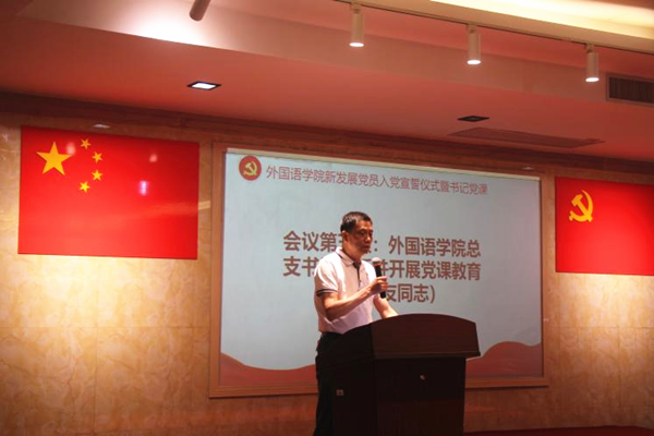 本网讯(记者 魏幼霞 陈裕鑫)2022年6月8日晚,外国语学院于A6-201召开了新发展党员入党宣誓仪式暨书记党课教育。外国语学院党总支书记张四友同志、学生第一、二、三党支部全体党员、2022年上半年新发展的11名预备党员以及入党积极分子参加了本次会议。