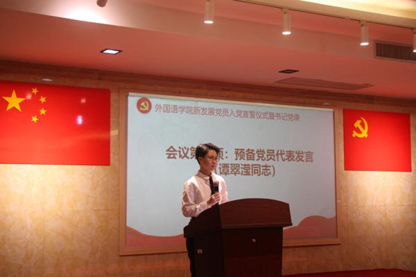 会议第四项,2019级商务英语专业谭翠滢作为预备党员代表发言,从六个方面阐述了大学三年的思想变化历程以及如何发挥好先锋模范作用,向正式党员前进,表达了新发展党员履行党员义务的信心和决心,尽自己所能为学院发展效力,服务同学,不负党和国家的寄托和期望。