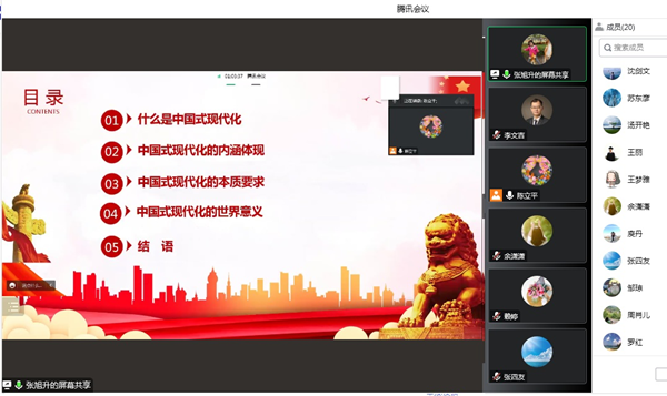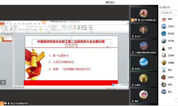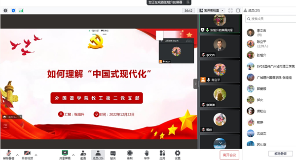 (本网讯:记者 张旭升)为深入学习宣传贯彻落实党的二十大精神,引导广大党员进一步统一思想认识、明确目标方向、强化使命担当,2022年12月22日晚上8点,外国语学院党总支教工第二党支部召开了以“深入学习宣传贯彻落实党的二十大精神”为主题的支部党员大会和以“如何理解‘中国式现代化’”为主题的党课学习会,支部全体党员参加了本次党员大会和党课学习。教工第二党支部书记陈立平同志主持了党员大会和党课学习;党课由支部宣传委员张旭升同志主讲。