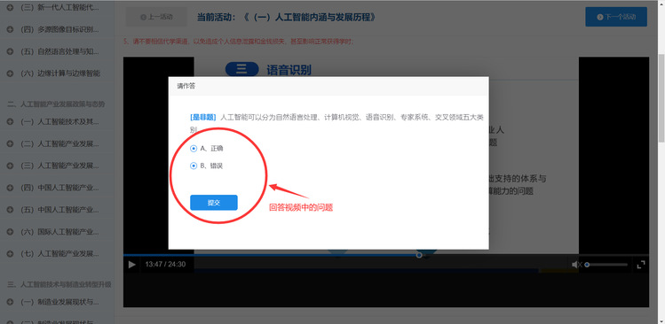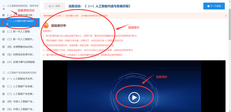 2、查看课程活动,阅读温馨提示,点击播放按钮,观看视频学习