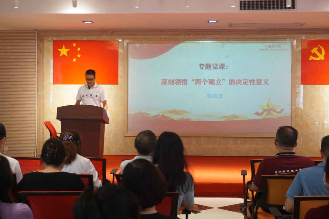 最后,张四友同志以“深刻领悟‘两个确立’的决定性意义”为主题开展专题党课。重点讲述了“两个确立”的内容、“两个确立”的原由,以及“两个确立”的决定性意义。张书记满怀激情地说道:“14亿人的大国,56个民族,没有一个强大的组织,没有一个核心的带领,要干成这么一件大事,是难以想象的,所以说‘两个确立’决定着新时代新征程党的使命能否顺利完成,目标能否顺利实现。这就是“两个确立”的决定性意义之所在!”