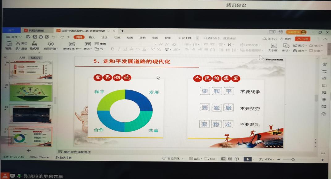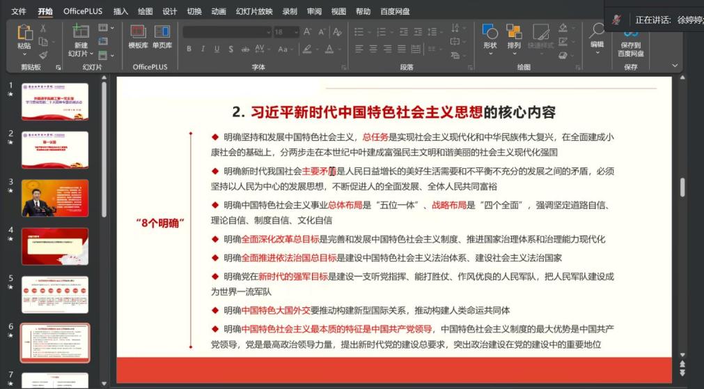 会议伊始,徐婷婷书记带领大家进行第一议题的学习——习近平新时代中国特色社会主义思想是党和国家必须长期坚持的指导思想。习近平新时代中国特色社会主义思想是对马克思列宁主义、毛泽东思想、邓小平理论、“三个代表”重要思想、科学发展观的继承和发展,是马克思主义中国化最新成果,是党和人民实践经验和集体智慧的结晶,是中国特色社会主义理论体系的重要组成部分,是全党全国人民为实现中华民族伟大复兴而奋斗的行动指南,必须长期坚持并不断发展。徐婷婷书记从“习近平新时代中国特色社会主义思想”的核心要义、核心内容和理论品格三个方面进行了详细的解读和阐释。
