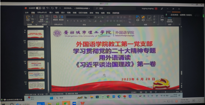 本网讯(记者 郭莹)6月28日,外国语学院教工第一党支部开展学习贯彻习近平新时代中国特色社会主义思想主题教育专题培训。全体党员教师深入践行党的二十大精神,贯彻学习习近平新时代中国特色社会主义思想主题教育,旨在进一步提高党员教师的政治理论水平和党性修养。以下是此次专题培训的主要议题和精彩内容。