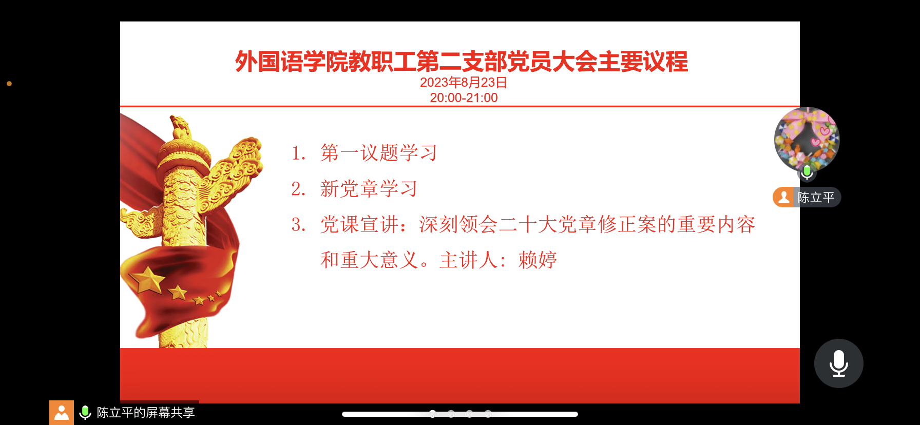 本网讯(记者 李文吉)8月23日晚,为不断加强党的政治建设,明确政治方向,深入开展学习贯彻习近平新时代中国特色社会主义思想主题教育,做到主题教育暑期不断线,外国语学院教职工第二党支部在线召开了以“学习党章”为第一议题的支部党员大会和以“深刻领会二十大党章修正案的重要内容和重大意义”为专题的党课。教职工第二党支部书记陈立平同志主持了党员大会,赖婷同志主讲了党课。
