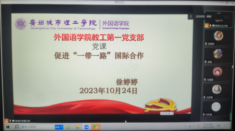 本网讯(记者 郭莹)2023年10月24日,外国语学院教工第一党支部书记徐婷婷为大家讲授“促进‘一带一路’国际合作”的专题党课,支部全体党员参加了此次党课。