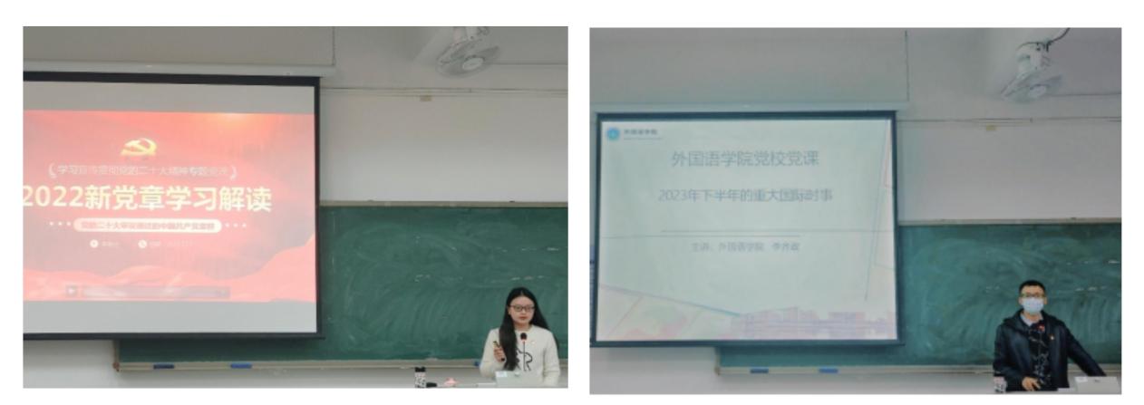 党课培训第二项内容由外国语学院党总支组织委员李齐政同志带领同学们进行时事政治的学习,主要从2023年下半年的重大国际事件展开,目的是让各位同学紧跟时事、与时俱进,拓宽他们的视野、全面地看待社会问题,同时起到提高同学们的思想政治觉悟的功能。李齐政同志先指出同学们学习时事政治的误区,再加以剖析,给予同学们宝贵的建议。接着以当今国际的四个热点事件为例子展开具体教育,在探讨过程中李齐政同志鼓励同学们深入思考当下时事政治的相关问题。