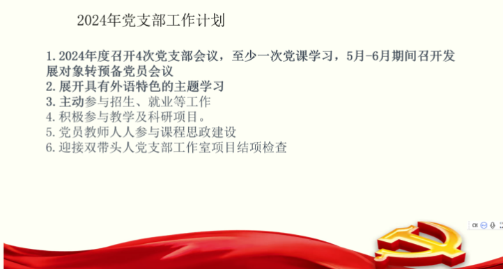 会议最后,徐书记对本次学习会进行了总结,并部署了2024年党支部工作计划,具体如下: