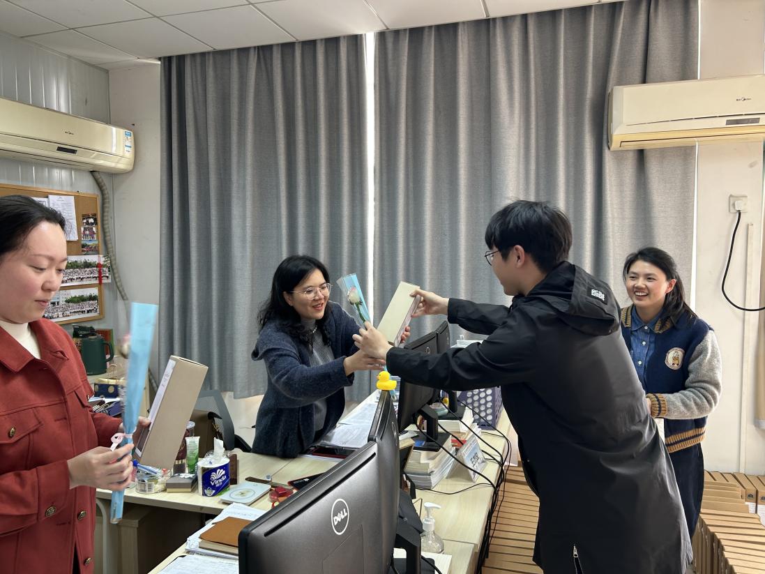 外国语学院团委、学生会代表向女教师送上节日礼物(伦康琪 摄)