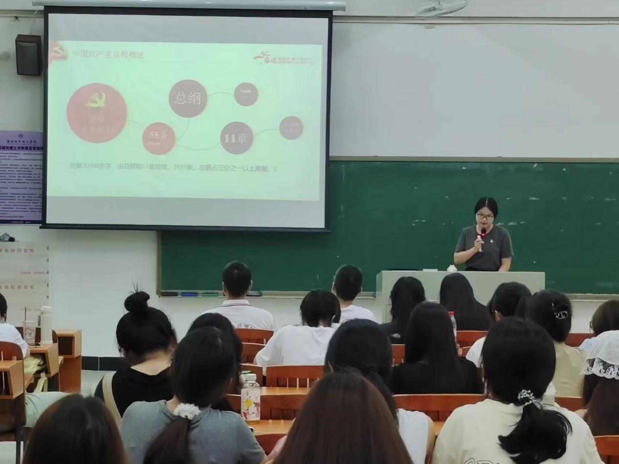 党课培训第一项内容是由学院党务中心负责老师李彩兰带领大家一起学习和解读新党章。在解读党章的过程中,李彩兰老师首先概述了党章的基本框架和主要内容,帮助同学们建立了对新党章的整体认识。接着,她详细解读了党章的重点内容,包括党的性质和宗旨、领导地位和奋斗目标、党的理论和路线方针政策等。随后她对二十大修改的新党章进行了深入解读,逐条分析了各项修改的背景、意义和影响,帮助同学们了解这些修改背后的深层次原因和考量。通过新党章的学习,同学们对其内容有了更加清晰、全面的认识,也进一步增强了对党的理论、路线、方针和政策的认同感和归属感。
