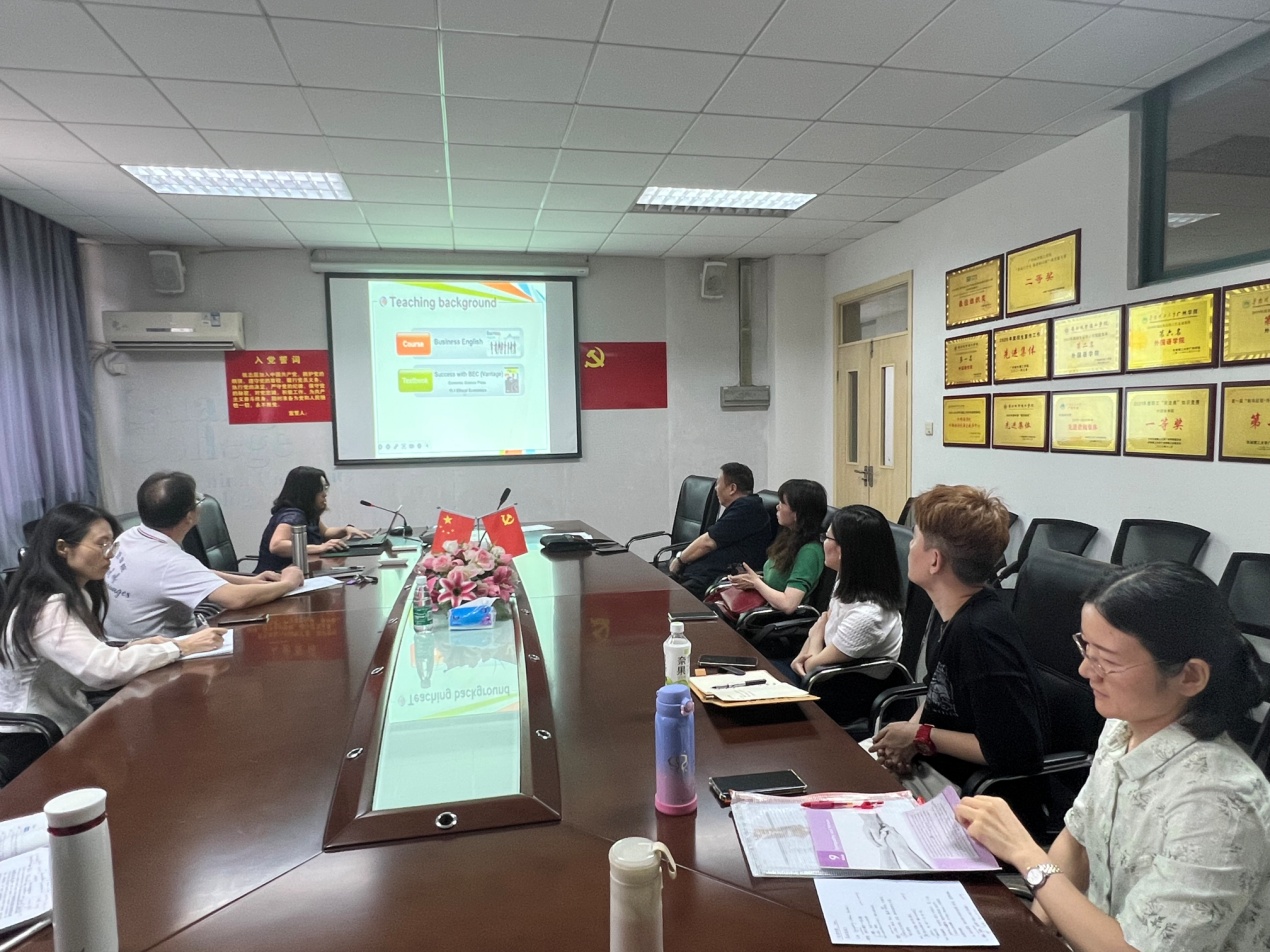 商务英语教研室在A6-214进行了说课磨课研讨,活动由教研室主任侯松山教授主持,广东培正学院唐棠副教授担任磨课专家。侯松山教授带头说课,紧接着,周肖儿、李志坚、陈相云、曾艳、俞立、赖婷等6位教师也分别对商务英语专业不同课程进行了精彩说课。