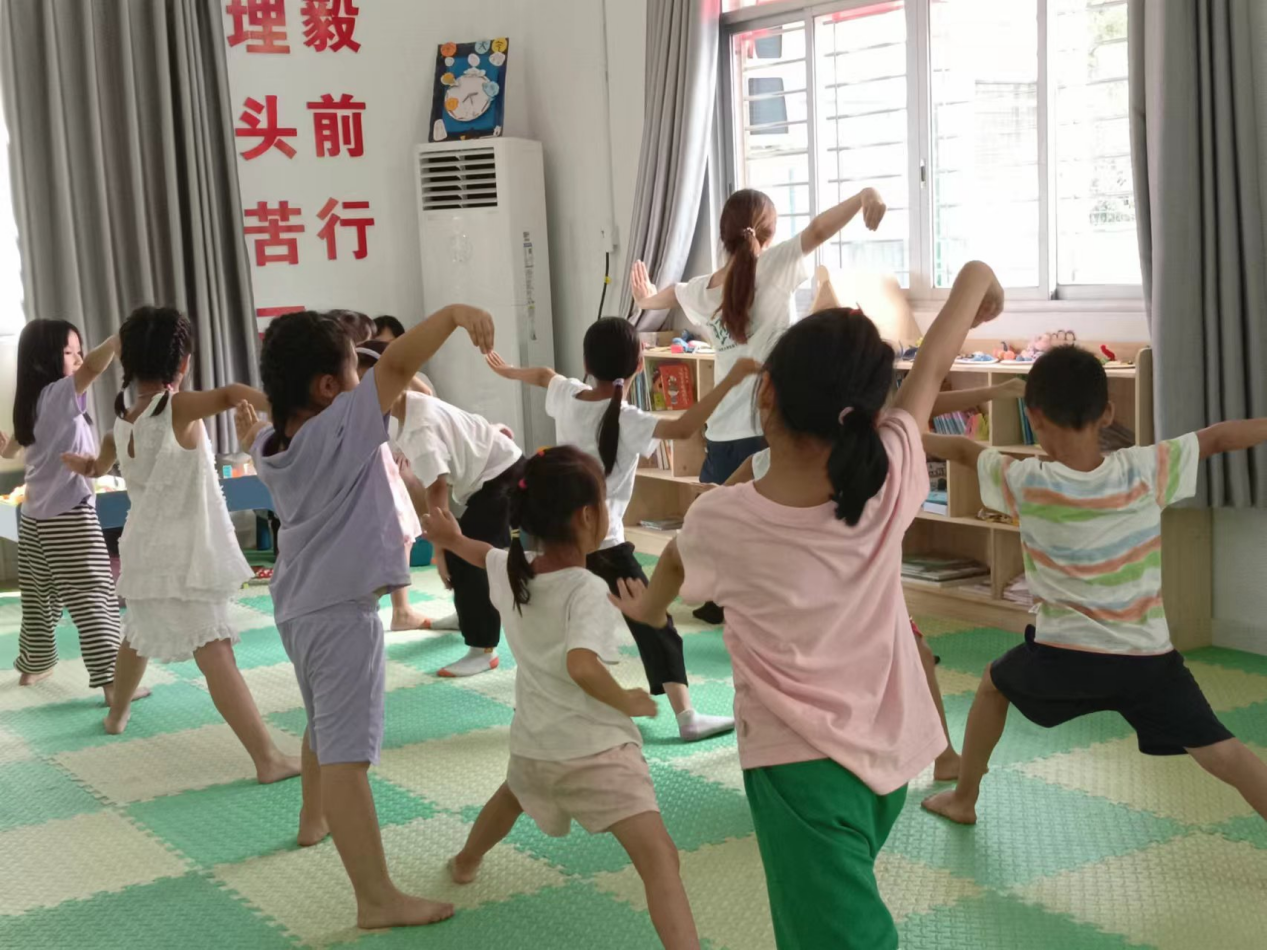 开课仪式结束后,实践团两名成员郑美婷、陈嘉芳为13名小朋友讲授硬笔书法基本笔画课程,通过讲授汉字书法起源与发展,规范小朋友们书写坐姿、握笔姿势与基本笔画,奠定了后续书法课程学习的基础。下午,实践团两名成员李嘉盈、苏靖炫给另外9名小朋友带来现代舞《Happy》的舞蹈教学。授课老师通过分解舞蹈动作、借助舞蹈音乐节拍帮助小朋友们快速掌握舞蹈动作要领。当音乐响起,孩子们整齐地舞动起来,在自由的氛围中展现自我。这不仅仅是一次支教课程教学,更是一次心灵的交流和成长的陪伴。