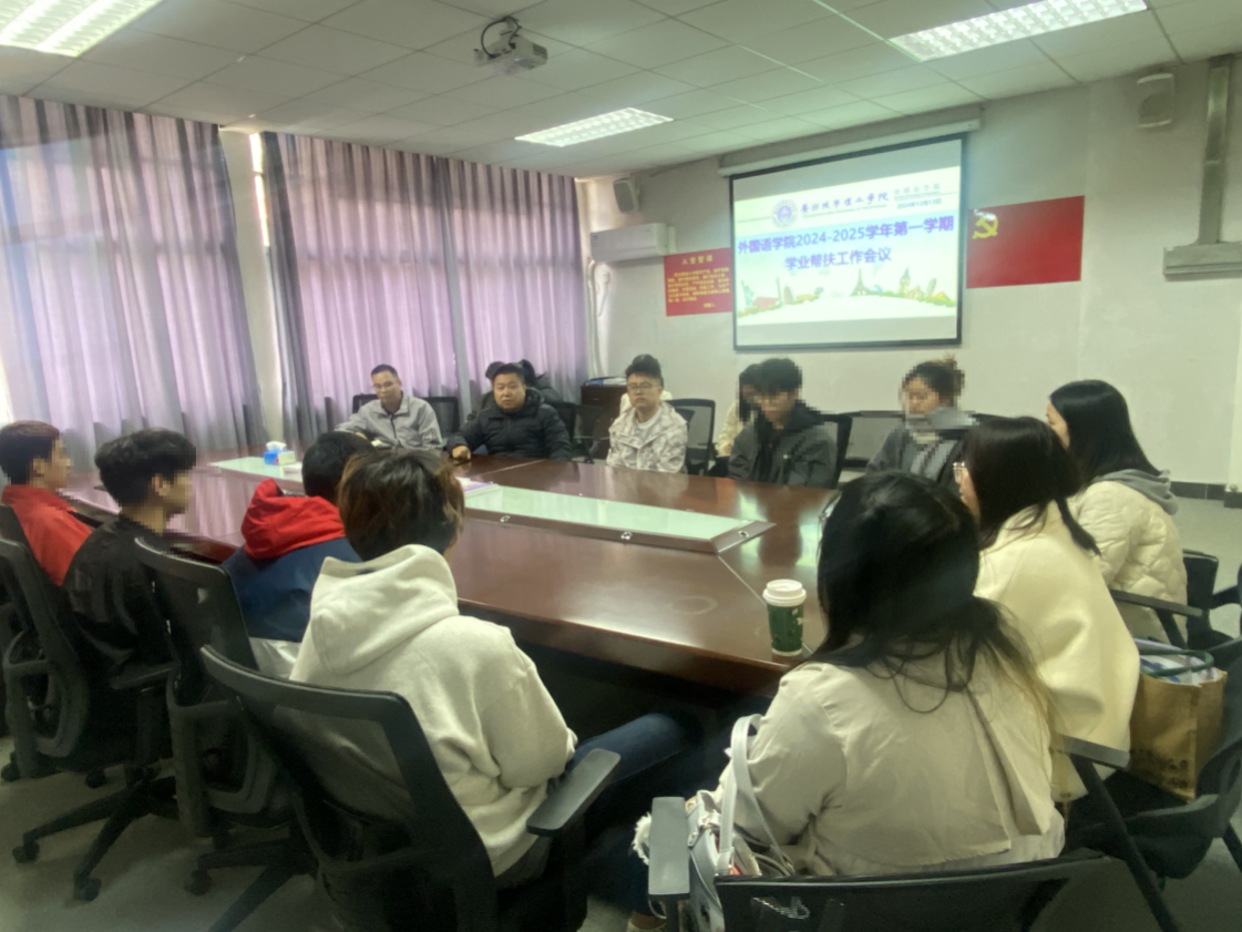 本网讯(记者 李小蕾)为加强学院学风建设,帮助学业预警学生明确学业目标,提升学习动力,解决学习中的实际困难, 12月13月中午,外国语学院在A6-214会议室召开了学业预警学生座谈会。学院常务副书记李伟、学工办副主任袁善福、学院全体学业预警学生以及对应班主任和辅导员参加了会议。