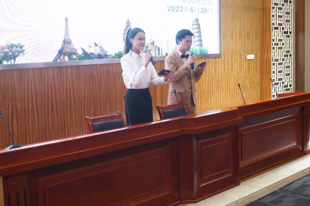 出席本次决赛的嘉宾和评委有学校党委副书记、副校长刘洊波教授,学校副校长魏德敏教授, 外国语学院院长向前进教授,外国语学院党总支书记张四友教授,学校团委王羽书记以及朱必前教授,侯松山教授,余潇潇副教授,姜洪良老师,蒋梦菲老师。