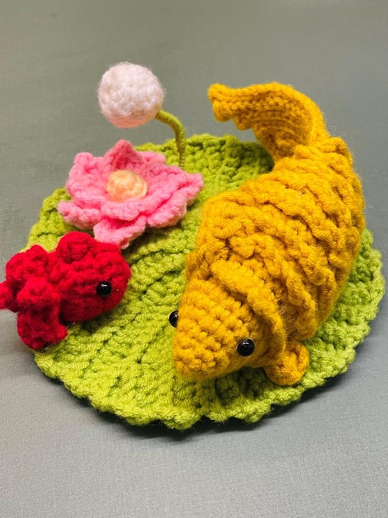 《莲花塘里鲤鱼游》钩织作品以鲤鱼和莲花为主题,采用传统手工艺精心编织而成。鲤鱼象征着富贵和好运,莲花则寓意纯洁和高雅。作品色彩鲜艳,形象生动,将两大吉祥元素完美结合,传递出对美好生活的向往和祝福。
