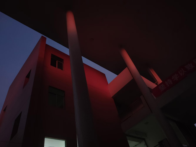 此作品是我在某一个去上晚修的傍晚的路上用手机抓拍到的一个教学楼的画面,地点是风雨长廊,当时觉得这个绯红色的夕阳晕染了这个教学楼感觉瞬间赋予了它温度与细腻的温柔。