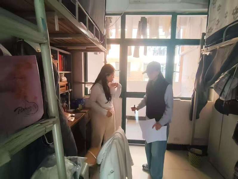 由辅导员老师、学生会干部、班委组成的检查小组深入学生宿舍,对C5、C9、C10、C14、C12、C15楼栋学生宿舍的卫生状况、物品摆放、用电安全等方面进行了全面细致的检查。在卫生检查中,大部分宿舍地面干净整洁,桌面物品摆放有序,床铺平整利落,展现出同学们良好生活习惯。同时,检查小组也重点关注了宿舍的用电安全,仔细排查是否存在私拉乱接电线、违规使用大功率电器等安全隐患,并向同学们强调安全用电的重要性。