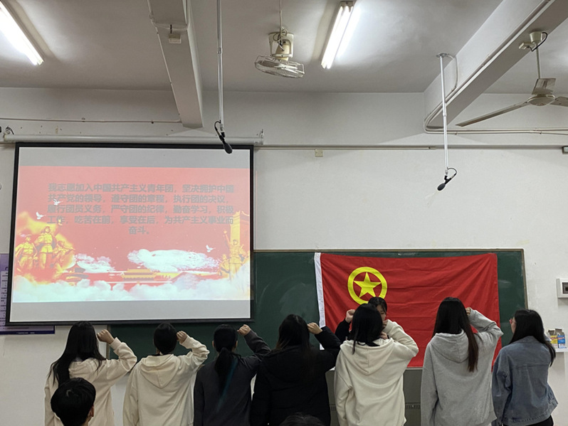接下来进行的是入团仪式,为加强青年思想政治引领,增强团员光荣感和组织归属感,坚定不移“听党话、跟党走”。大会第一项:奏唱国歌。团员们用响亮的声音奏唱国歌,他们的脸上充满了对国家的自豪,彰显了他们坚定的意志和不屈的精神。大会第二项:宣读新发展团员名单。大会第三项:豆芹兰老师为新发展团员佩戴团徽 豆芹兰老师对新团员寄予了深切期望,希望他们“听党话、跟党走”继续保持优良作风,成为新时代的好青年。大会第四项:入团宣誓。在主持人的带领下,新团员们铿锵有力地宣读入团誓词,团员们的声音响彻在整个教室,展现了他们为祖国奉献的坚定意志。大会第五项:宣读团员的权利和义务此次宣读,使新团员更加清楚地了解了自己的权利与义务,让他们能够更好地为人民服务、为祖国做贡献。