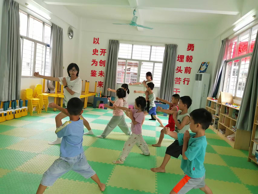 7月20日上午的课程为武术表演,由团队成员刘璇越和吴依如进行授课,内容为自选长拳的片段教学。课程教学主要分为两部分:第一部分包括跑步、踢腿、压韧带等的热身运动以及砸拳,正踢,扎马步的基本功。第二部分是套路的教学,包括一系列的拳法和腿法。授课老师示范教学后,学生进行分组对练,在相互学习中共同进步。通过武术学习,学生可以增强体质,锻炼意志,增强自律能力,促进学生身心的全面发展。