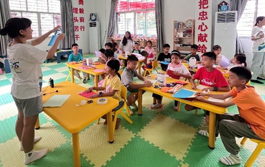本网讯(记者 豆芹兰、温喜娇、李浣淇)外国语学院共建“幸福九潭”实践团,7月21日到23日在九潭村“小站家”为5-12岁的小朋友们,进行了第三轮的六门美育课程教学。