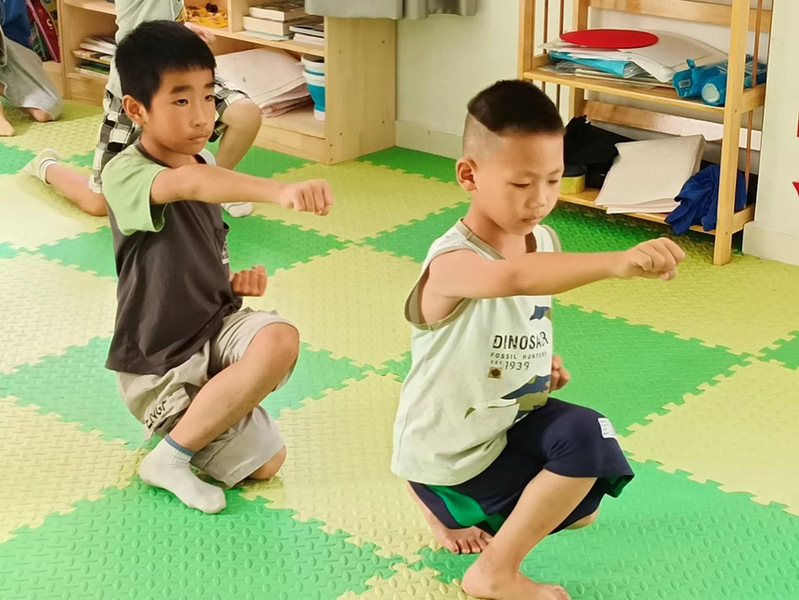 7月23日下午是武术表演课程。由实践团成员刘璇越和吴依如两位授课老师进行“五步拳”的课程教学。武术基本功巩固后,授课老师分步讲解并示范了“五步拳”的基本动作,同时教导学生们保持呼吸的均匀和心态的平和。在分组练习中,授课老师一一对小朋友们的动作进行纠正与指导,让他们激发对武术表演的热情且意识到武术表演的多样性和艺术性。