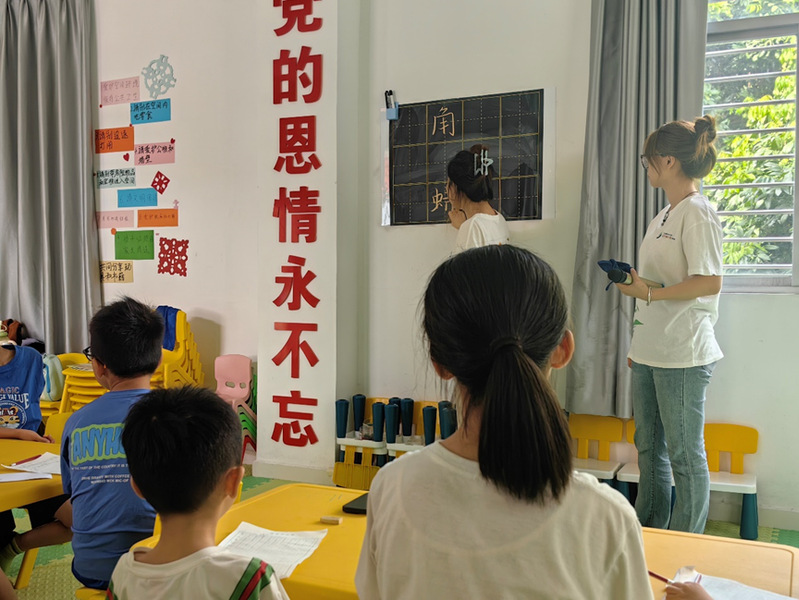 “小荷才露尖尖角,早有蜻蜓立上头。”7月24日上午,实践团两位成员郑美婷和陈嘉芳以古诗《小荷》带领孩子们走进硬笔书法的奇妙世界,感受汉字的独特魅力。授课老师把每一个生字都拆解开来,从结构到笔画顺序,再到书写的力度和节奏,细致入微地教导小朋友们。掌握生字后,孩子们开始全神贯注地临摹授课老师在黑板上提前写好的《小荷》作品。小朋友们作品中的字体流利自然,点画之间相得益彰,展现了他们认真刻苦的致学精神。