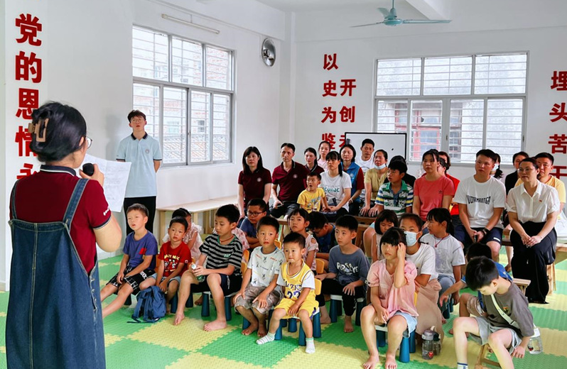 本网讯(记者 蔡晓坤、方映纯)7月22日,由外国语学院组织的大学生“三下乡”之共建“幸福九潭”实践团赴花都区秀全街九潭村流书社党群服务红色驿站开展为期15天的美育支教。当天上午9时许于九潭村流书社党群服务红色驿站二楼举行了开课仪式。参加开课仪式的嘉宾有秀全街党建组织工作组组长冯宝玲,九潭村副书记毕平烽,九潭村村委副书记、九潭村和街道党建办人员、秀全街团工委黄丽君书记,秀全社工站彭思品、李露、刘思颖,项目指导老师蔡晓坤、余潇潇、姜洪良,我校大学生志愿者梁惠容、吴梓涵、邱栋晔、陈昭霓、何俊强、余钰茵以及20位小朋友和家长。仪式上,团队队长方映纯向家长和小朋友们介绍了项目的组织情况和课程安排;随后,课程授课老师一一自我介绍;最后进行破冰活动,通过与家长和小朋友们提问项目的细节进行互动,帮助居民更加了解项目,安心将小孩送到儿童空间学习,接受我们的美育课程支教服务。