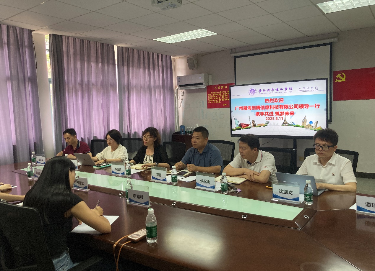 本网讯(记者 李小蕾)为积极响应国家产教融合战略,推动高校人才培养与产业需求深度衔接,6月11日,广州城市理工学院外国语学院与广州易海创腾信息科技有限公司举行产学研合作商谈会。外国语学院党总支常务副书记李伟、副院长乔世燕、各教研室主任与广州易海创腾信息科技有限公司业务部门负责人齐聚一堂,双方围绕校企协同育人主题展开深入交流,在实践教学、课程共建、人才培养模式创新等领域达成多项合作意向,为构建“资源共享、优势互补”的校企合作生态奠定基础。