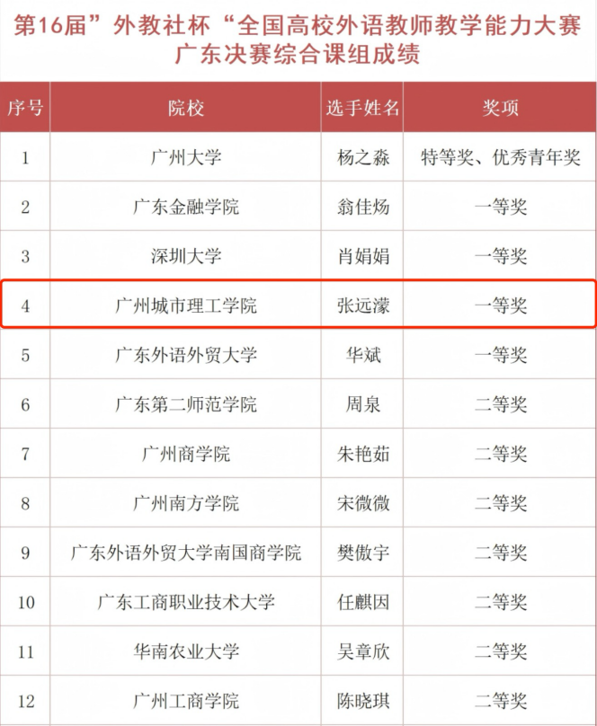 本网讯(记者 邓昕婧)2025年6月7日,第16届“外教社杯”全国高校外语教学能力大赛(大学英语组)广东省决赛圆满落幕。本次大赛分为综合组和听说组两个组别,吸引了全省多所本科院校的优秀教师参与角逐。经过初赛、复赛的层层选拔,我校外国语学院青年教师张远濛老师凭借扎实的专业素养、创新的教学设计和出色的临场表现,在决赛中脱颖而出,荣获综合组一等奖,展现了我校外语教师的风采。
