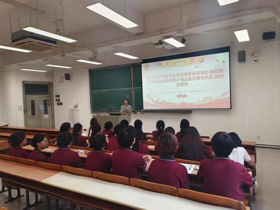 接着聚焦当下,豆芹兰老师带领全体学员学习习近平总书记的重要讲话精神以及给谢依特小学戍边支教西部计划志愿者服务队全体队员回信全文,进行了深度的剖析与解读。也着重向学员们介绍谢依特小学戍边支教西部计划志愿者服务队的事迹,观看了《一抹红:南疆村小的春天》,志愿者们响应国家号召,奔赴祖国最需要的地方,在艰苦的环境中坚守教育岗位,为边疆孩子带去知识与希望的故事。在交流发言中,学员们结合自身实际,踊跃发言,周伊凡同学激动地说:“听了支教志愿者们的故事,深受鼓舞;总书记的回信让我们看到了国家对青年一代的期望,我们要努力学习,增长本领,将来为国家建设添砖加瓦。”