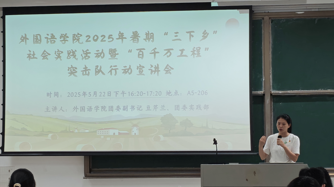 本网讯(记者 李彩兰、温喜娇)5月22日下午,外国语学院2025年暑期“三下乡”社会实践活动暨“百千万工程”突击队行动宣讲会在A5-206教室如期举行。本次宣讲会吸引了各学院的同学参与,现场气氛活跃。此次宣讲会旨在为同学们解读政策方向、分享实践经验,并动员青年大学生积极投身乡村振兴实践,用青春力量赋能县域发展。