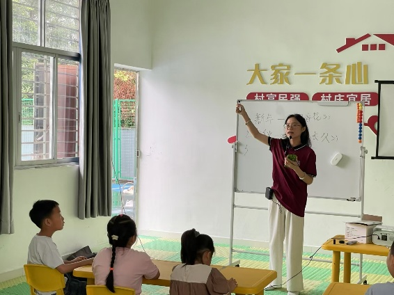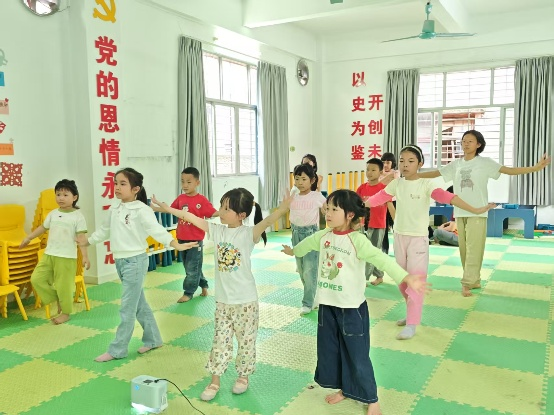 5月25日下午,志愿者赖燊仪首先带领小朋友们进行了舞蹈的学习。课堂上,小朋友们学习古典舞基本手部动作,包括 “提腕、压腕、绕腕” 等规范动作要领,引导小朋友们感受古典舞手部姿态的韵律之美。随后,志愿者教授了优美的《鸳鸯戏》舞蹈,小朋友们跟随节奏认真学习,在一招一式中体会古典舞的艺术魅力。课间休息期间,志愿者组织了丰富有趣的小游戏,在“你比划我猜” 环节中,小朋友们发挥想象力,用生动的肢体动作进行词语比划,以及经典的萝卜蹲、丢手绢等游戏更是让小朋友们热情高涨,你追我赶,整个课堂洋溢着欢声笑语。
