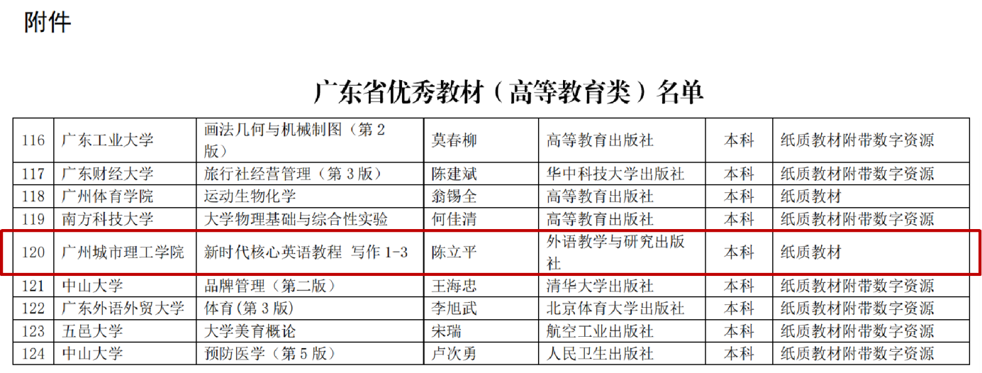 本网讯 (记者张佳佳)近日,广东省教育厅发布《关于广东省优秀教材(高等教育类)名单的公示》通知,广州城市理工学院外国语学院陈立平教授主编的《新时代核心英语教程 写作1-3》荣膺广东省优秀教材称号。这一荣誉不仅是对该系列教材在英语写作教学领域创新实践的权威认可,更彰显了其在提升教学质量方面的显著成效,标志着该教材的编写理念与实践价值获得学界高度认可。