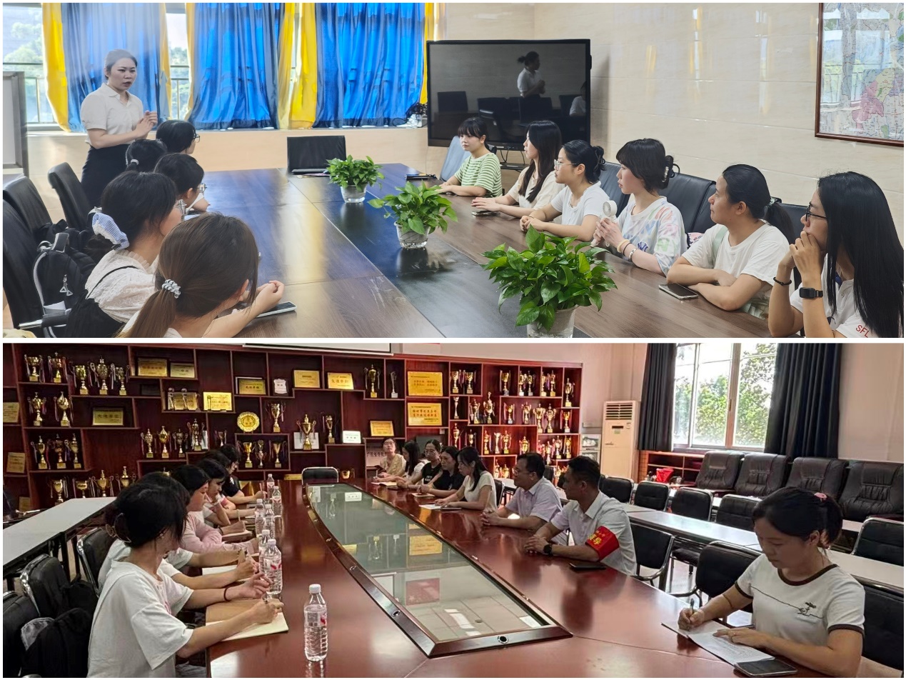 动员环节结束后,15名实习学子分为两支队伍,由学院辅导员分别带队前往红棉小学与学府路小学。抵达后,辅导员与两所学校负责人召开交接会议,明确“一对一”指导、教研参与、课后服务协助等安排,学子们在指导教师带领下参观校园,难掩期待与激动。