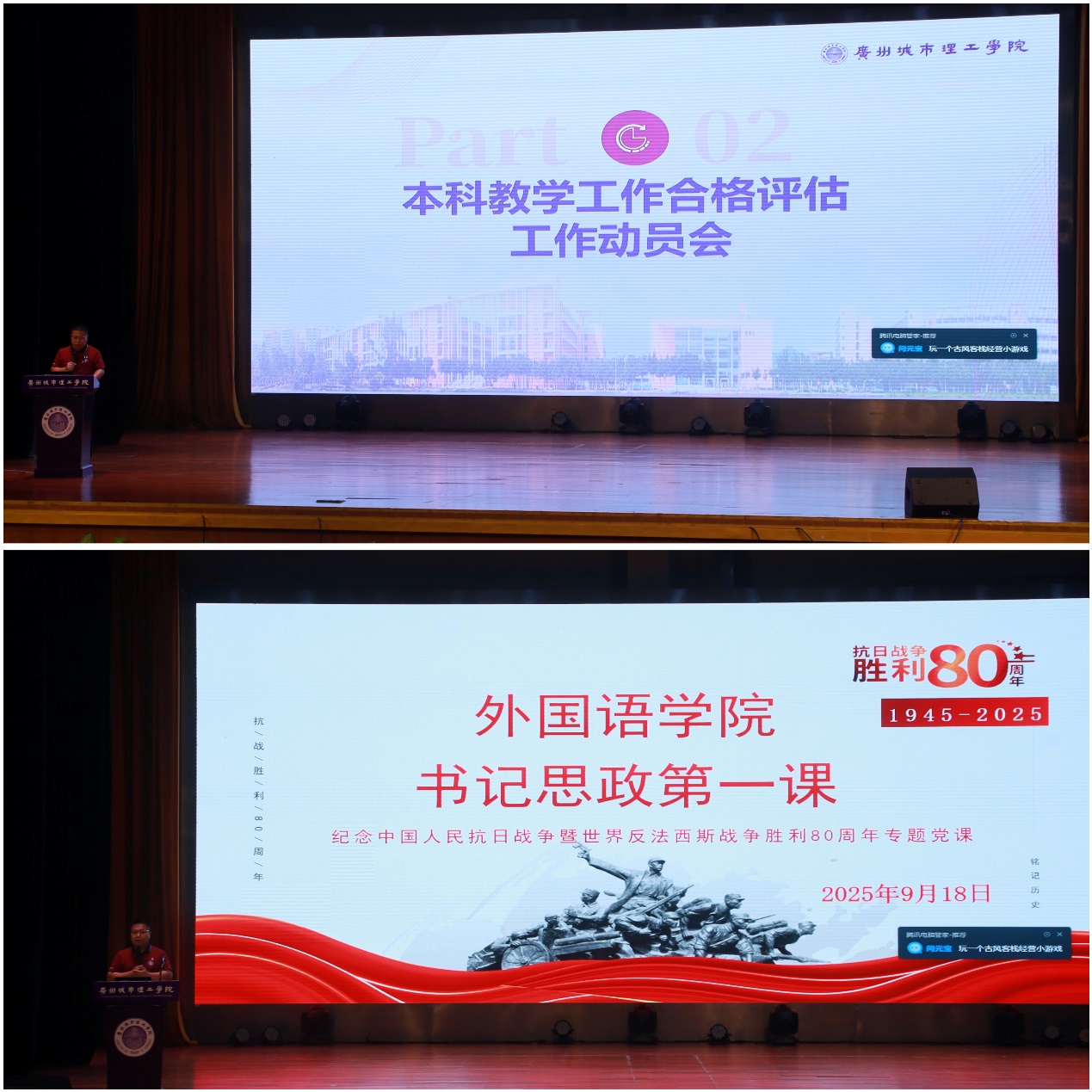 随后,李伟以“凝心聚力迎评估,砥砺奋进促成长”为题展开动员,并讲授思政第一课。在评估工作讲解部分,李伟副书记用“学院发展的‘里程碑’、专业建设的‘试金石’、学生成长的‘助推器’”三个比喻,生动阐释了本科教学工作合格评估的重要意义。他结合教育部评估指标体系,从课程设置优化、教学质量监控、实践教学强化、学生满意度提升等方面,详细介绍了学院的评估准备进展与下一步工作重点,并向全体学生发出“三个主动”倡议:主动参与课堂互动,提升专业知识掌握度;主动配合评估调研,客观反馈学习需求;主动参与校园文化活动,展现外语学子风貌。在书记第一课环节,他围绕“抗战胜利暨世界反法西斯战争胜利80周年”主题,通过讲述抗日英烈故事、分享当代青年使命案例,引导学生从历史中汲取精神力量,深刻理解“爱国”不仅是情感认同,更是“学好专业知识、服务国家需求”的实际行动。他特别鼓励外语专业学生,要以语言为桥梁,讲好中国故事、传播中国声音,将个人理想融入国家发展大局。