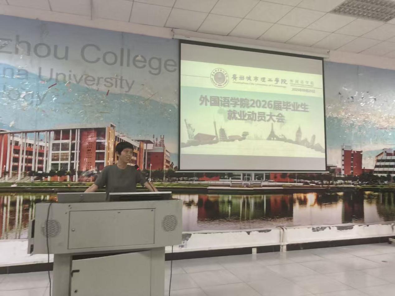 本网讯(记者 李小蕾)为帮助2026届毕业生提前明晰就业方向、提升求职竞争力,9月25日下午,外国语学院在A6-101召开2026届毕业生就业动员大会。学院常务副书记李伟、教授陈立平、毕业班辅导员及全体2026届毕业生参会,特邀广州易海创腾信息科技有限公司交付中心总经理朱颖仪作为企业代表,双专家联动为学子送上针对性就业指导。
