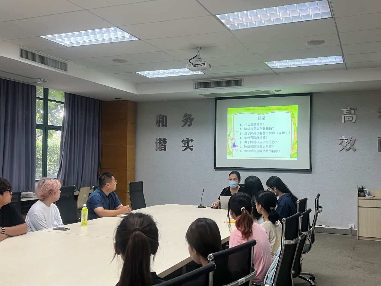 本网讯(记者 李小蕾)为进一步提升学院师生对肺结核的科学认知与主动防范能力,切实守护校园公共卫生安全,10月16日下午,外国语学院联合校卫生所,特别邀请秀全社区卫生服务中心盛医生,面向学院师生开展肺结核防控知识专题讲座,为师生健康保驾护航。